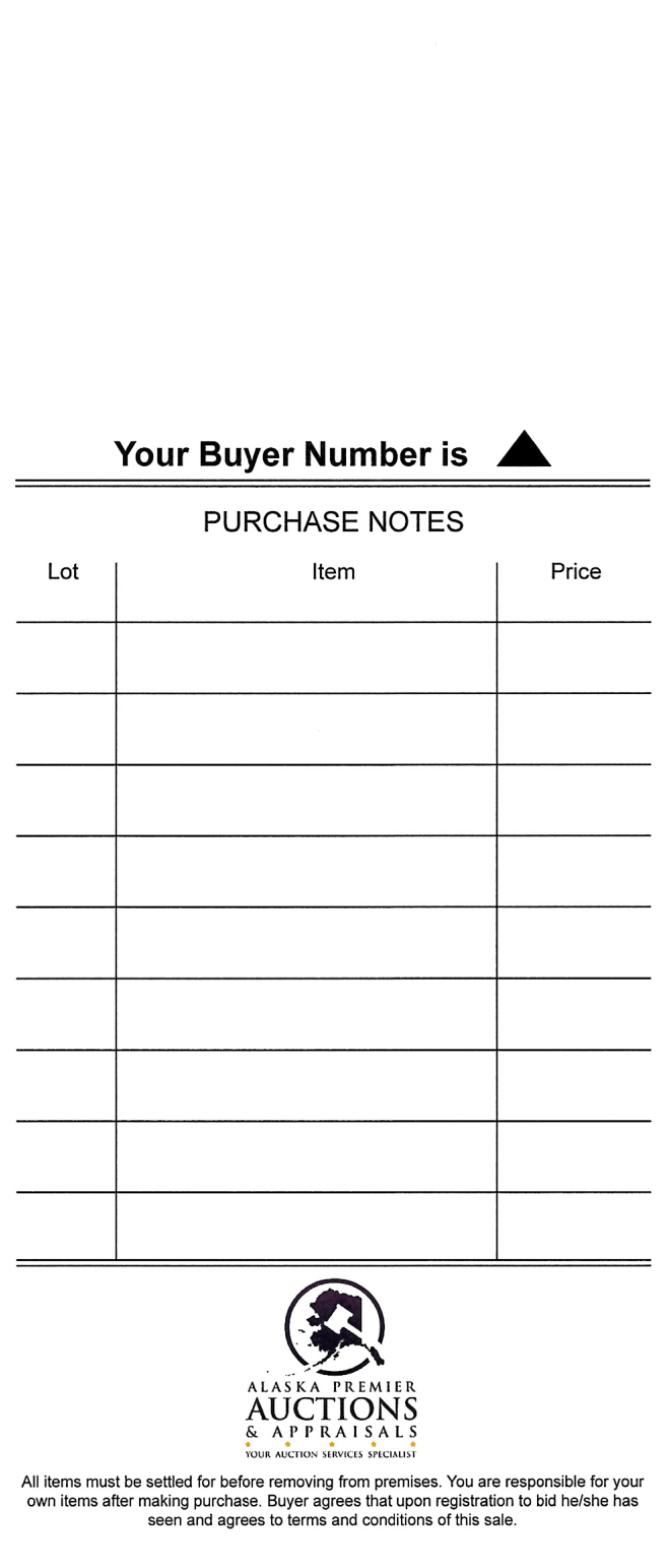 To pay with a cashier's check or wire transfer, please email us at info@AlaskaPremierAuctions.com with at least 24 hours advance notice to ensure we've received your request.